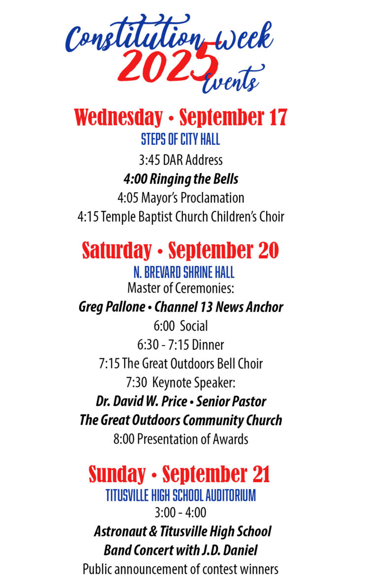 Constitution Week 2025 Celebrations! Titusville, Florida September 17 -21 Planned Events Ringing the Bells September 17, 2025 Indian River officers Children’s Choir singing Mayor Connors Regent Arnold receiving the proclamation from the Mayor Constitution Dinner September 20, 2025 Bell Choir Song Commodore John Barry Chapter Speaker Dr. David Price – Historian Master of Ceremonies: Greg Pallone Anchor Spectrum News 13 Poster contest winners Essay winners and parents Constitution Week Committee Members Constitution Concert September 21, 2025 THS & AHS Jazz Bands JD Daniel Program Constitution truck!